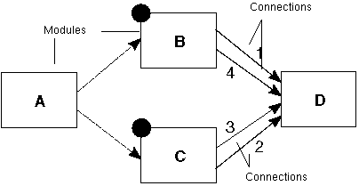 Figure B-2 shows the possibility for confusion when a map is fired and several datasets move downstream. There are four modules, A, B, C, and D, and six connections that we are interested in. Module A is wired to modules B and C and modules B and C both have two connections to module D. Each dataset flowing through the map carries with it information about the module that initiated it. Each module contains a topology influence table that allows it to compute the set of ports to invalidate in the event that another port receives data from a given upstream module. In this case, D's table says that both ports depend on data from module A, so that arrival of data from module A on port 1 (via module B) should also invalidate port 2 (from C).