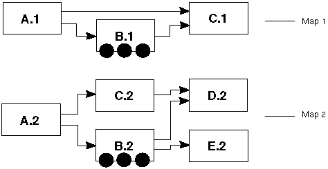 Figure B-3 illustrates how frame identifiers can keep data ordered when there is a multiple data flush. When a module fires due to an upstream event, it copies the frame identifier from its input frame over to its output frame. This allows it to propagate the correct frame identifier through the downstream portion of the map. But when a module sends several sets of output by using the cxOutputDataFlush routine (three shaded circles on B.*), assigning that upstream frame identifier to all of its output frames would force the downstream map of out sync, creating a deadlock (module C.1 would expect multiple inputs from A.1 on its first port). Thus the second and all subsequent flushes must create a new frame identifier listing the flushing module as the originator.