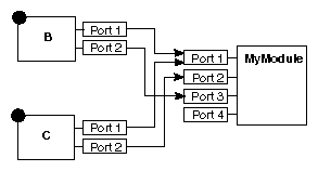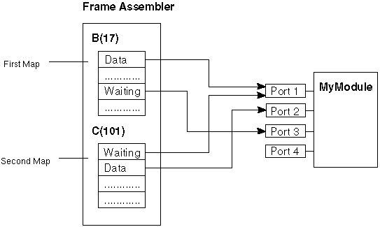 Figure B-4 shows a map with two firings. Modules B and C have each output data from two ports, and MyModule has received the data on three of its ports.