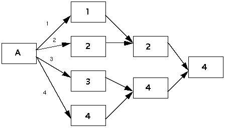 For instance, the map in Figure B-6 shows how many downstream modules can fire before the reader has sent output on all ports. The independent flows of data are labelled 1, 2, 3, and 4 on the output arcs. Modules are labelled with corresponding numbers to show which dataset sending causes them to fire. One module can fire when the first dataset is emitted from A, two on the second dataset, one on the third, and three on the fourth.