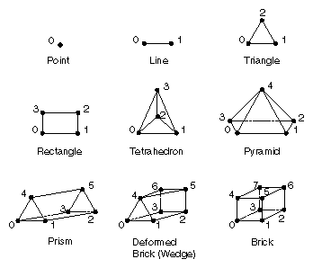(points), edges (lines), faces (polygons), elements (three-dimensional