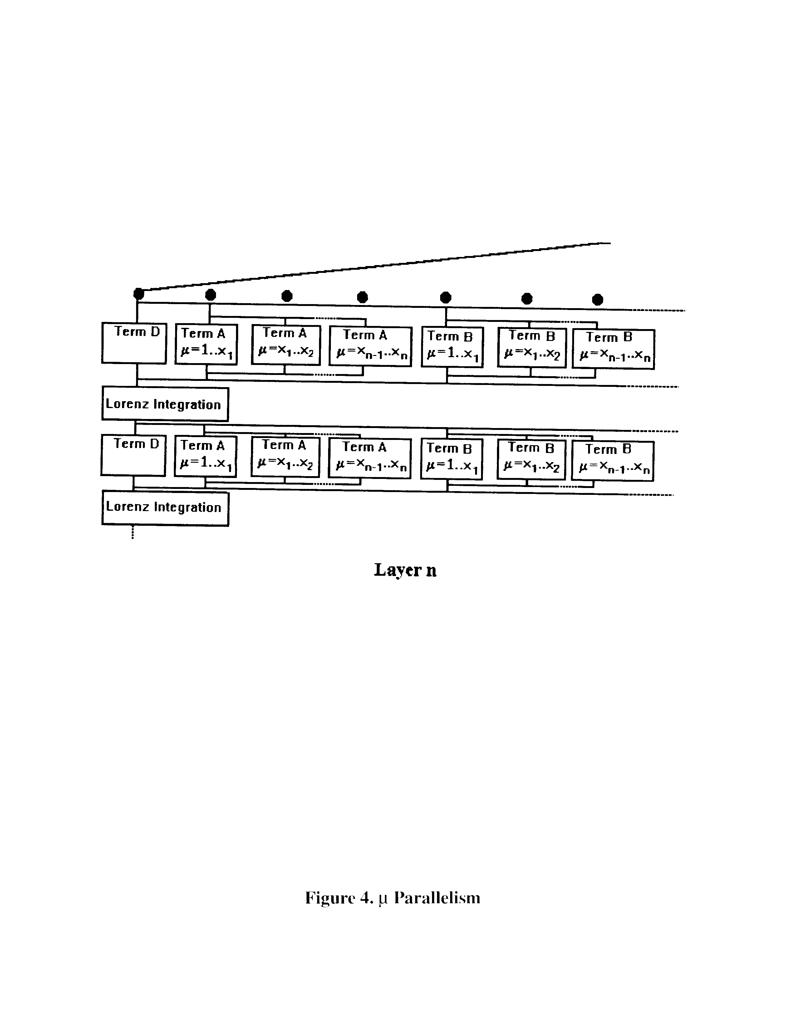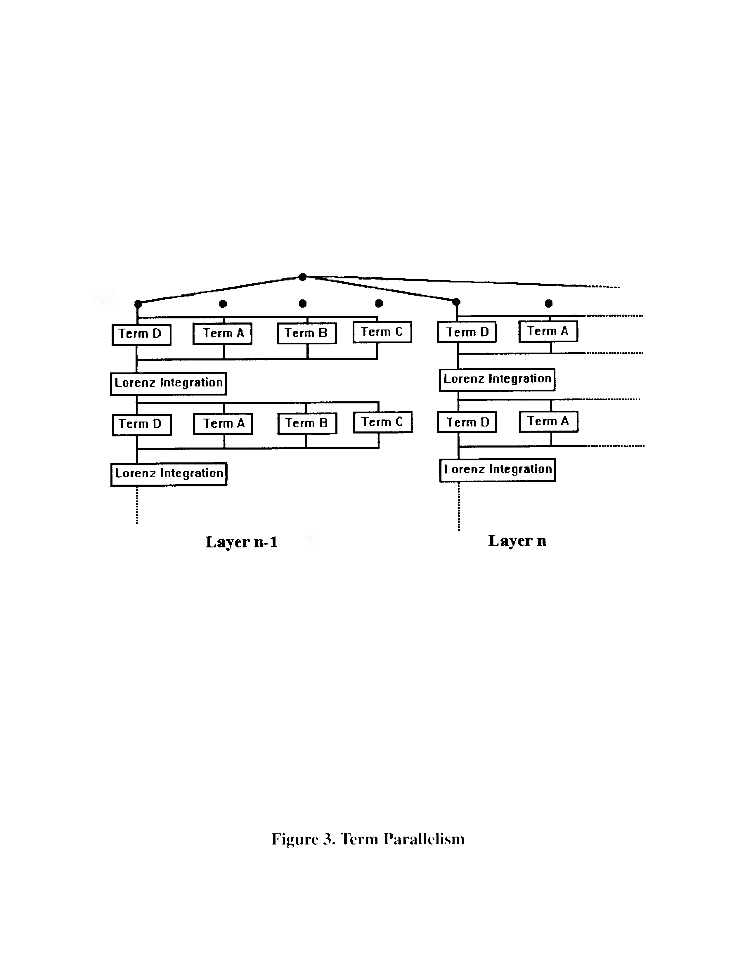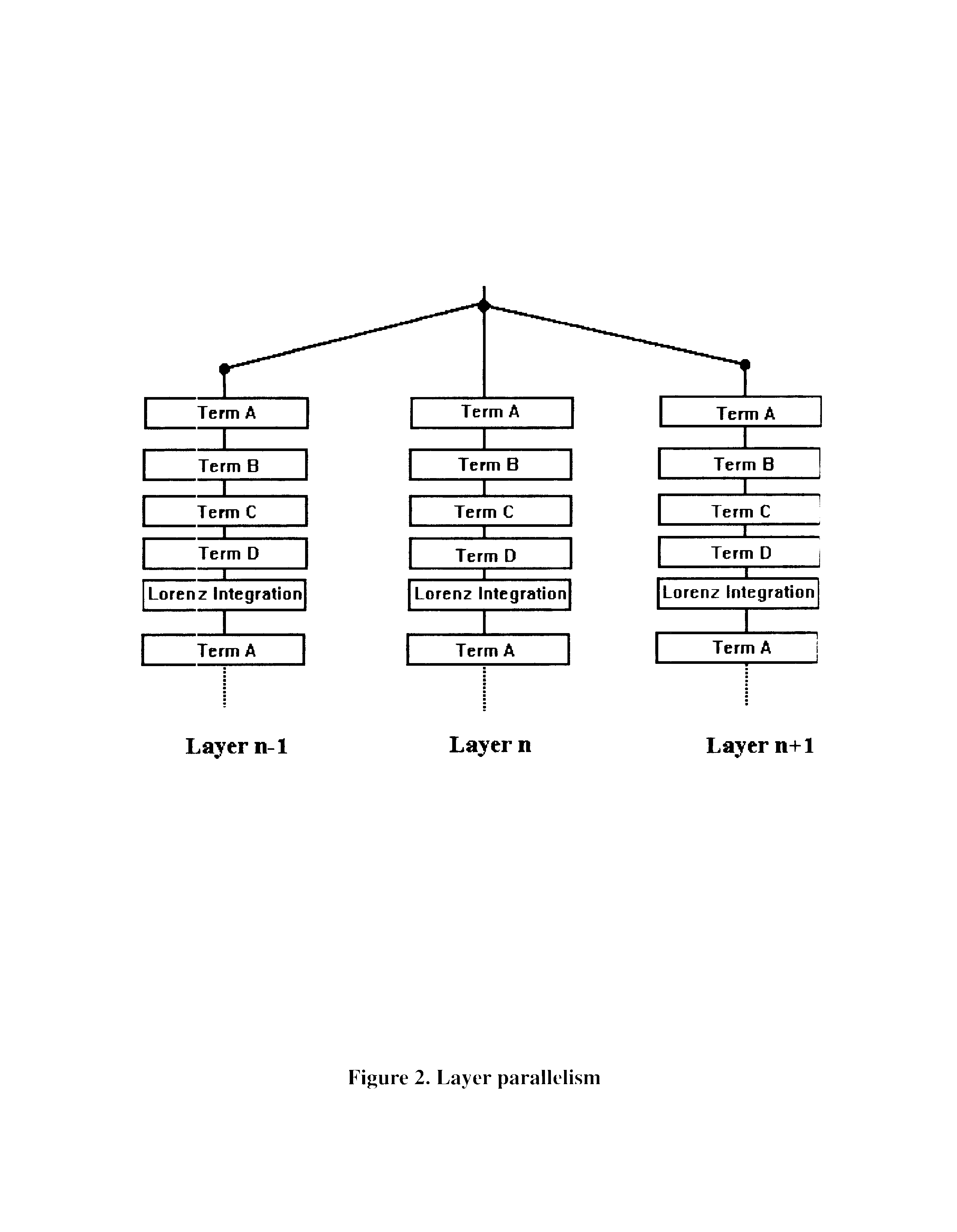 Figure 1 shows the basic, sequential implementation of our model. Here, while the terms can be calculated in any order, we show terms A-D being calculated one after the other. Figure 2 shows the first, simple methodology for parallelization, where each layer is calculated independently on a different processor. Figure 3 goes one step further to show the Parallelization of the A-D calculations within each layer. And Figure 4 goes on to show the Parallelization of the calculation of each term by latitude.