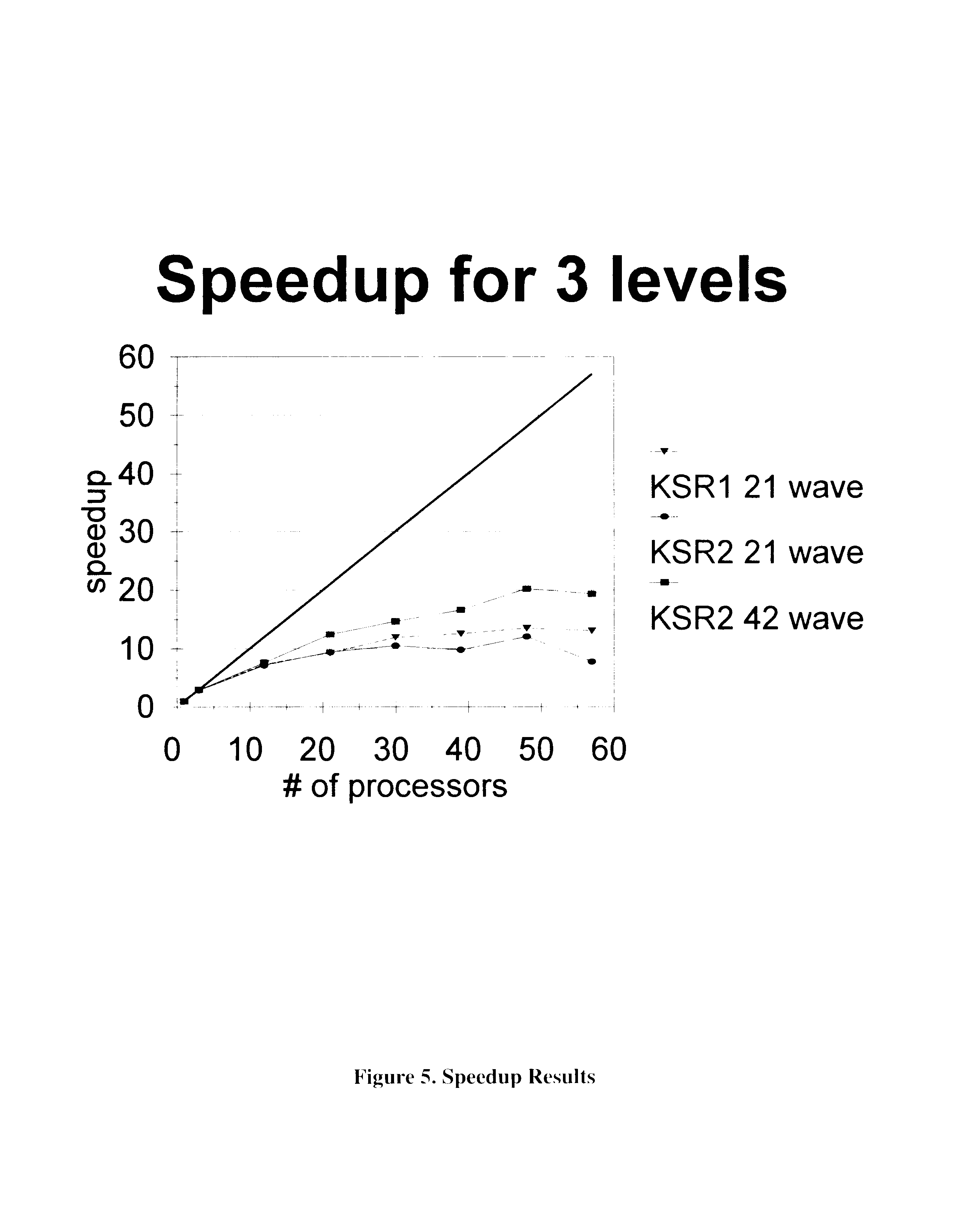 Figure 5 shows the speedup of the model thus far. The solid line designates the ideal speedup. Several things can be seen in this figure. First, due to the ring architecture of the KSR series systems, a slight drop in performance can be seen at 32 processors. As the model begins to move on to the second ring, some additional latency become apparent. This latency seems to balance out by the time we reach 40 processors.