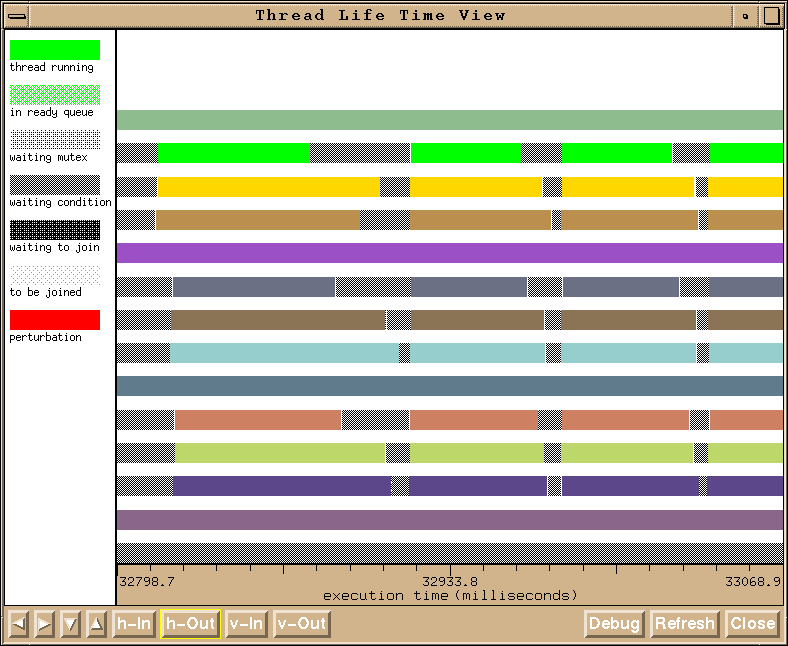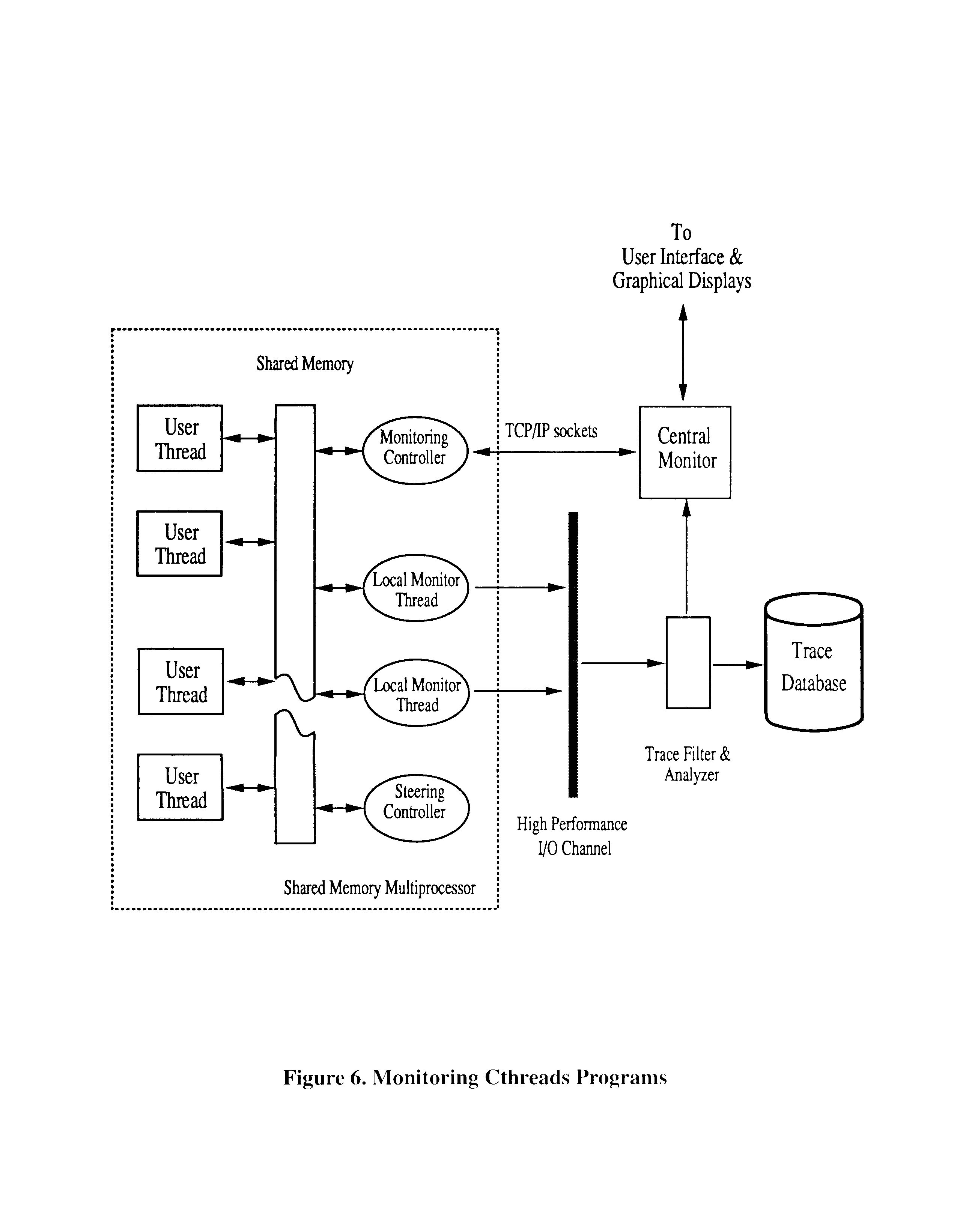 When the application is running, program and performance information of interest to the user and the steering algorithms is captured by the inserted sensors and probes, and is collected and partially analyzed by the run-time monitoring facility. The run-time monitoring mechanism essentially consists of monitoring data output queues attaching user threads being monitored to a variable number of threads performing steering and low-level processing of monitoring output. The partially processed trace data is fed to the steering mechanism to effect on-line changes to the program or the execution environment to improve the overall performance of the application, and to the graphical displays to show the application's program and performance behaviors to the user (Figure 7). The trace data can also be stored to a trace data database for future postmortem analyses. Further on-line filtering and analyses are performed before they can be consumed by the steering mechanism or the graphical displays. The monitoring, steering and user interaction controllers activate and deactivate sensors, execute probes or collect information generated by sampling sensors, maintain a directory of program steering attributes, and also react to commands received from the monitor's user interface. For performance, these controllers are physically divided into several local monitor controllers and a steering controller residing on the parallel program's machine and able to rapidly interact with the program, and a central monitor controller typically located on the front end workstation or the processor providing user interface functionality.