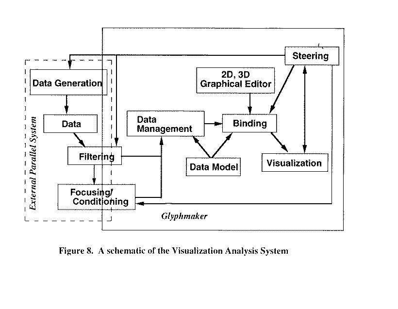 The schematic in Figure 8 shows our general VA system. Data generation, data filtering, and data focusing and conditioning will be performed on an external (i.e., parallel) set of processors in a distributed environment (denoted by the dotted outline). Some of these function could also be shared by the graphics workstation, depending on the complexity of the computation or size of the data, and thus straddle the dotted line. After the data is generated and filtered, it is sent to the Explorer environment (inside the solid outline) on the graphics workstation. The VA system is built on a set of tools we have developed called "Glyphmaker" [3,4], which we have extended for this application. Within the VA system (and Glyphmaker) is a data management scheme founded on a customized data model. The model provides great flexibility in access to the data because it builds up the data structure in layered parcels (called "baskets of eggs"), the lowest layer being the original data followed by filtered or conditioned versions and then by binding rules for the geometry to which the data is mapped. This structure allows a two-way path from original data to geometry and back. This is particularly powerful because one can select any set of geometrical objects and get back the detailed original data. Thus the user has a process for quantitative analysis of the data based upon a picture that she sees.
