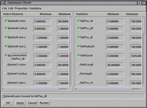 View of the Binder interface for mapping data variables onto glyph elements.