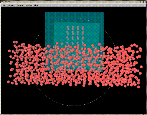 Molecular dynamics data with the Conditional Box surrounding a region. Special glyph bindings may be chosen for the data in this region.