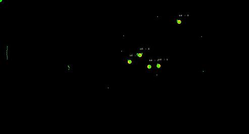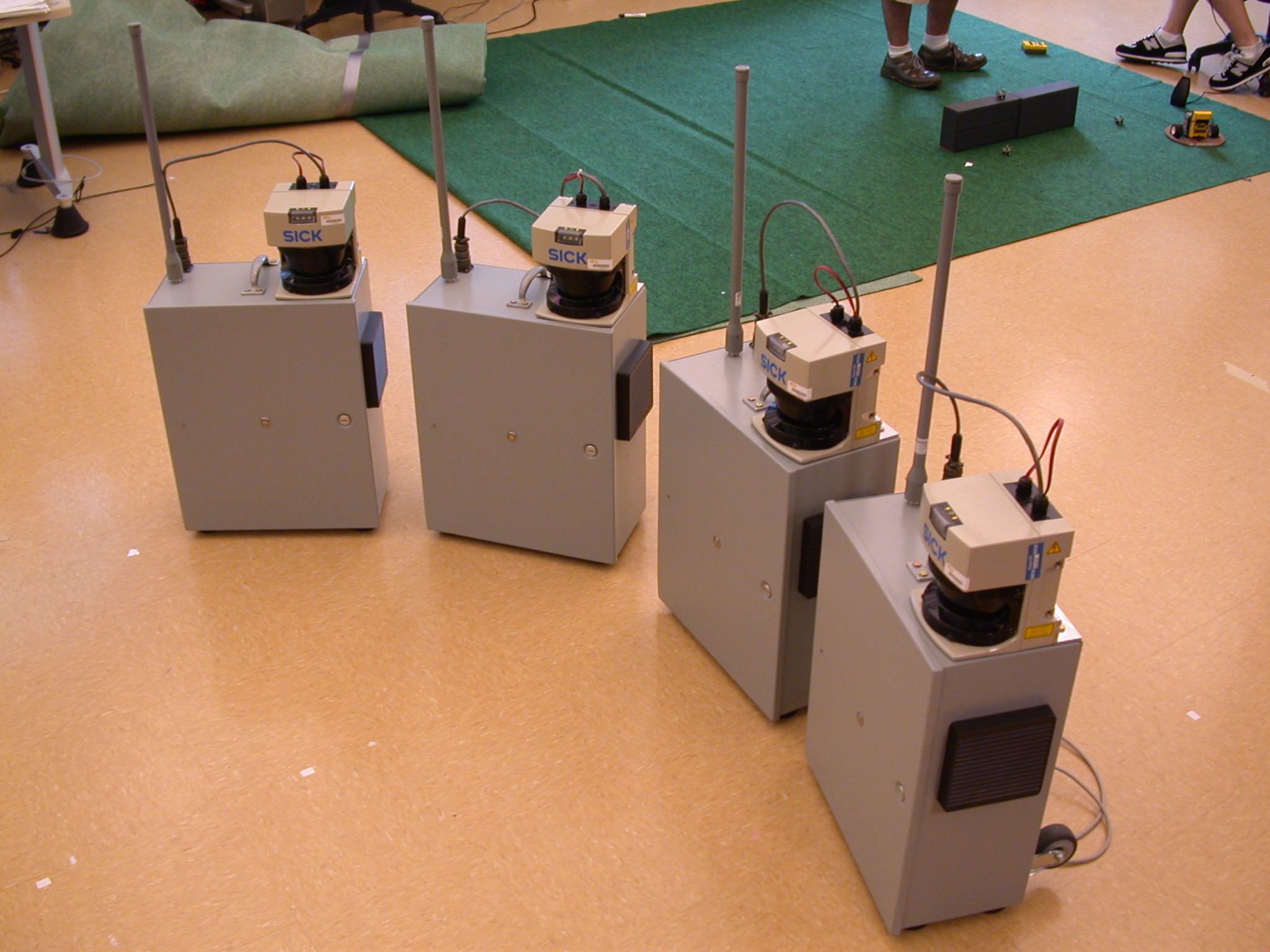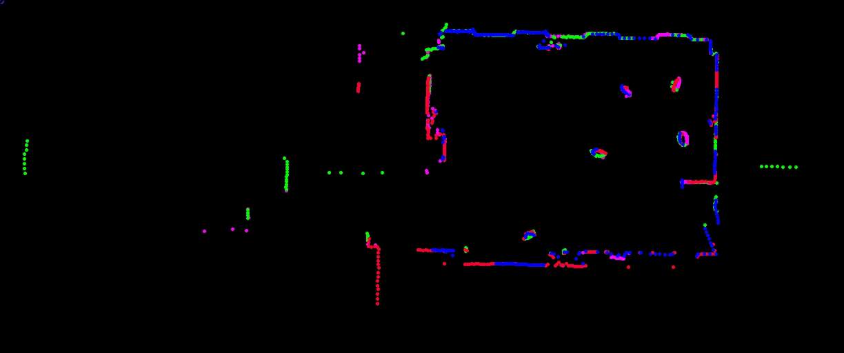 In this video, the raw data has been spatially and temporally registered. The dots are color coded based on which laser generated the hit, while the large circles represent the lasers. The large room contains two courts; our game was on the left court. |
