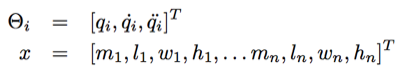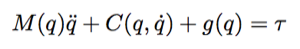 In general, the dynamics of a system in terms of the generalized coordinates q can be expressed in the above equation. Where M, C, g, is the generalized mass, Coriolis and conservative forces matrix, respectively. The dependence of the dynamics equations on the inertial calibration parameters and the functional relationship between q, its derivatives, and the torque can be made more visually explicit viewing the dynamics equation as: